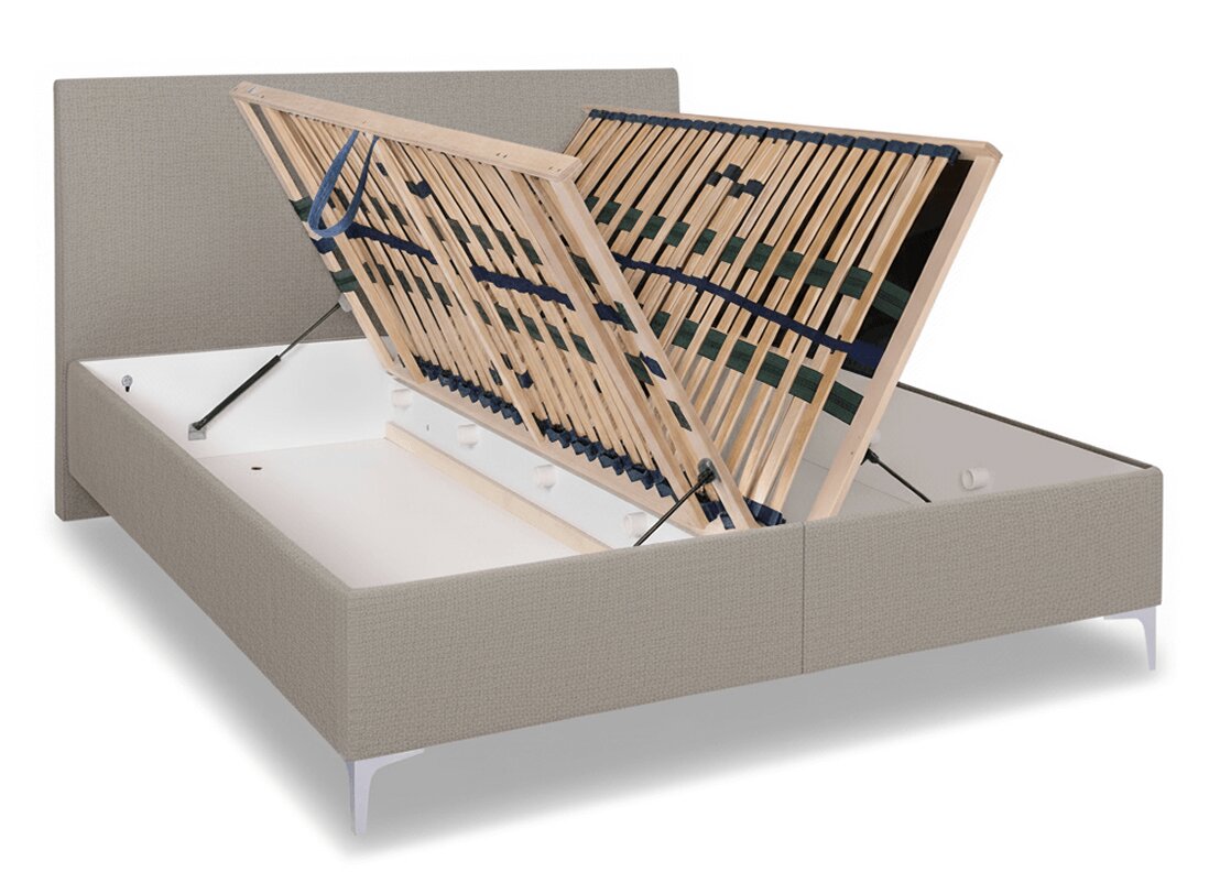 Veľkým benefitom je praktický výklopný úložný priestor s rozdelením na dve samostatné časti. Konštrukcia pôsobí stabilne a výklopné rošty sa dvíhajú ľahko vďaka plynovým piestom, ktoré umožňujú bezpečné a tiché otváranie. Rošt s lamelami z pružného dreva zároveň prispieva k správnej opore matraca a predlžuje jeho životnosť. Vysoká nosnosť roštu 150 kg/osoba je určite vítaným bonusom.