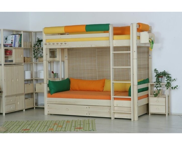 Postele je možné rozložiť na dve samostatne stojace. Pod spodnú posteľ je možné umiestniť úložné priestory. Pre malé deti môžete na spodnú posteľ nasadiť prenosnú detskú zábranu.