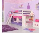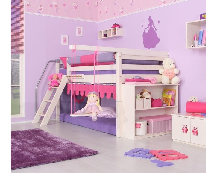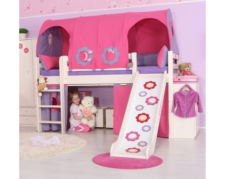 Textilné dekorácie nie sú súčasťou ceny postele. Ako príslušenstvo odporúčame dokúpiť nádherný látkový stan a domček, ktoré sú vyrobené v ružovo-fialovej farbe a budú krásnym doplnkom detskej izby.