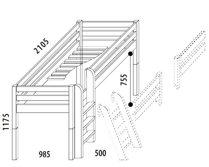 Súčasťou ceny detskej postele je šmykľavka a rebrík, ktoré môžu byť ľubovoľne umiestnené na pravej alebo ľavej strane postele. Pri rebríku si navyše môžete vybrať, či má byť šikmý alebo rovný.