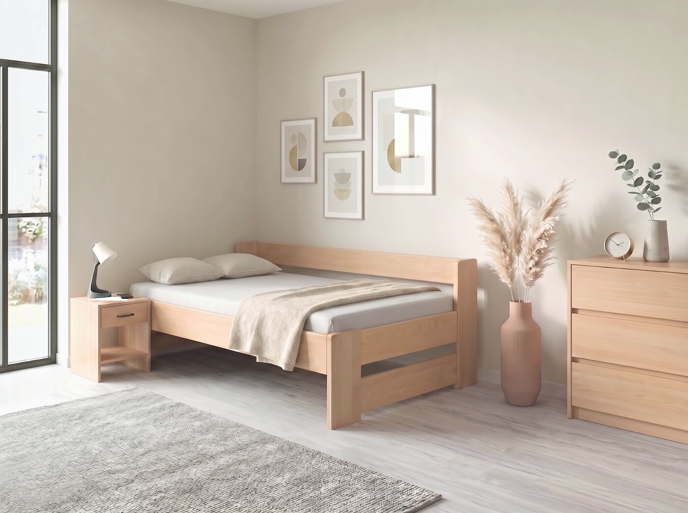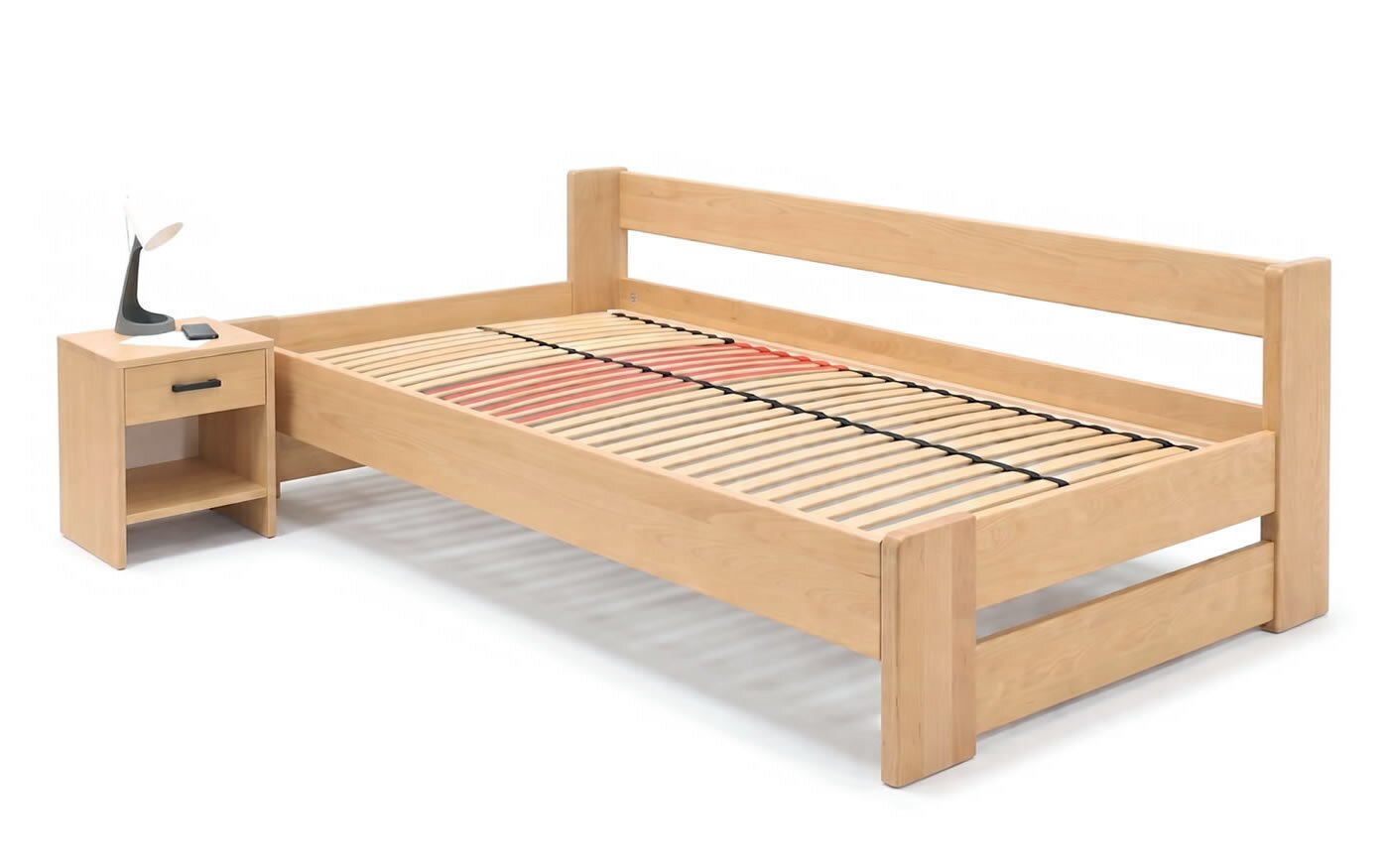 Na posteli MIVA oceňujem najmä kombináciu priebežného bukového masívu (žiadny cink/parketové vyhotovenie) a konštrukcie bez zbytočných komplikácií. Práve absencia úložného priestoru je v tomto prípade výhodou – posteľ pôsobí vzdušnejšie, ľahšie a konštrukčne veľmi čisto.