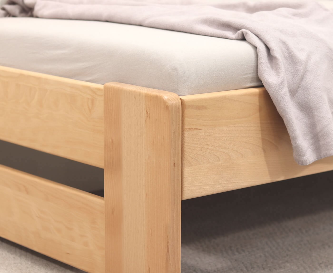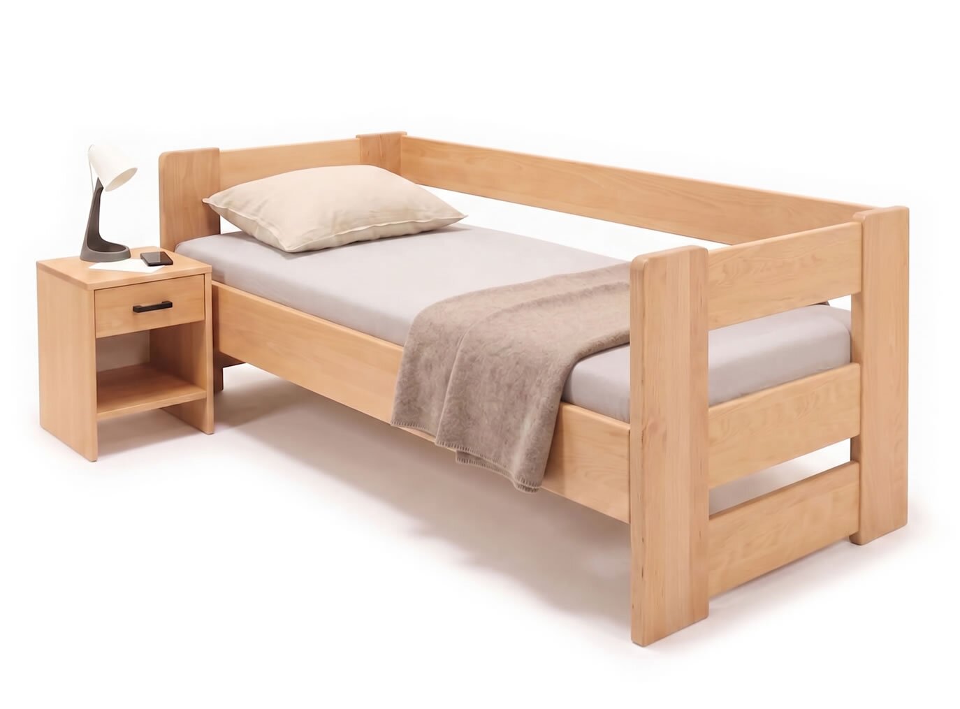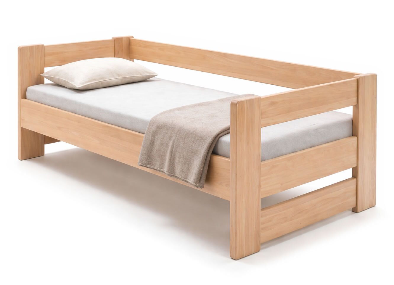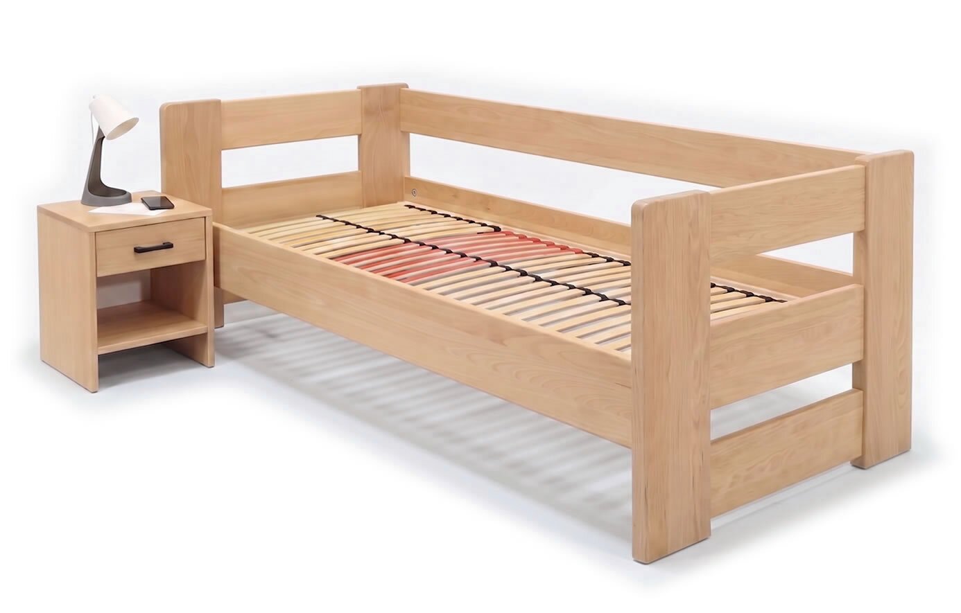 Na posteli MIVA oceňujem najmä kombináciu priebežného bukového masívu (žiadny cink/parketové prevedenie) a konštrukcie bez zbytočných komplikácií. Prevedenie s tromi čelami do „U“ je praktické nielen do detských a študentských izieb, ale aj do menších spální alebo izieb pre hostí, kde môže posteľ slúžiť aj ako pohodlné denné lôžko. Práve absencia úložného priestoru je v tomto prípade výhodou – posteľ pôsobí vzdušnejšie, ľahšie a konštrukčne veľmi čisto.