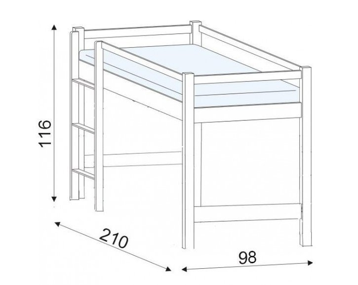 Posteľ je opatrená zábranou proti pádu zaisťujúcou bezpečnosť vašich detí. K výstupu na hornú posteľ slúži drevený rebrík. Vďaka nášľapom o dĺžke 9 cm je výstup veľmi pohodlný. Rebrík môže byť umiestnený ako na ľavej, tak na pravej strane postele, zákazník určí sám pri montáži. Priestor od zeme po vrchnú bočnicu je 75 cm. Detská zvýšená posteľ sa skladá z jednej lôžkovej časti na poschodí a spodného priestoru, ktorý možno využiť na hranie vašich ratolestí.