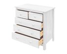 Táto komoda 5 zásuvková IA8081 z masívu borovice je v farebnom prevedení biely lak. Komoda sa skladá z dvoch menších a troch širších zásuviek s kovovými pojazdmi.