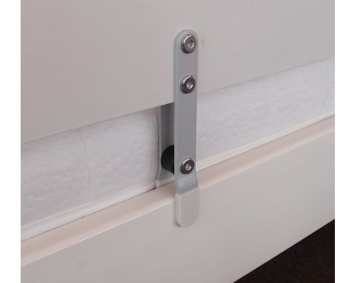 Medzi špeciálnymi "packami" tohto kovania sa nachádzajú integrované gumové valčeky, vďaka ktorým môžete nasadiť zábranu na dosku akejkoľvek postele o hrúbke 22-25 mm a 44 mm. Povolením alebo dotiahnutím skrutky medzi gumovým valčekom môžeme nastaviť zábranu ako kedykoľvek odnímateľnú alebo naopak pevne pripevnenú k posteli.