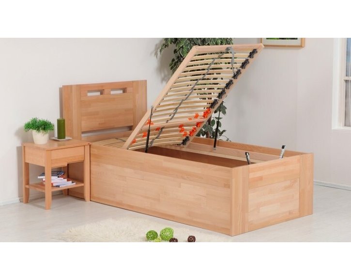 Jednolôžko s úložným priestorom Valencia Senior patrí medzi obľúbené modely v našom oddelení postele s úložným priestorom. Táto posteľ je vyrobená z masívneho bukového dreva v tzv. cinku, alebo parketovom prevedení (drevené dosky sú vyrobené zlepením menších dielov - parkiet). Vďaka veľkému úložnému priestoru, prístupnému pomocou vyklápacích lamelových roštov, plní táto posteľ funkciu praktickosti a predstavuje zároveň moderný dizajn.