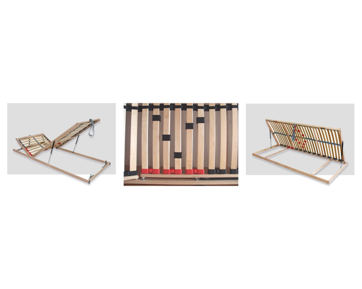 Vybírat můžete z bočního a čelního výklopu - lamelových nebo laťových roštů. Bočně výklopný rošt zajistí pohodlný přístup do úložného prostoru po celé délce postele. Rošt s vyklápěním od nohou - čelní výklop - nabízí také mechanické polohování hlavové části roštu. Vyklápění roštů je zajištěno pomocí kvalitních plynokapalinových pístů. Nosnost základních roštů je 120 kg, nosnost zátěžových pak 150 kg.
