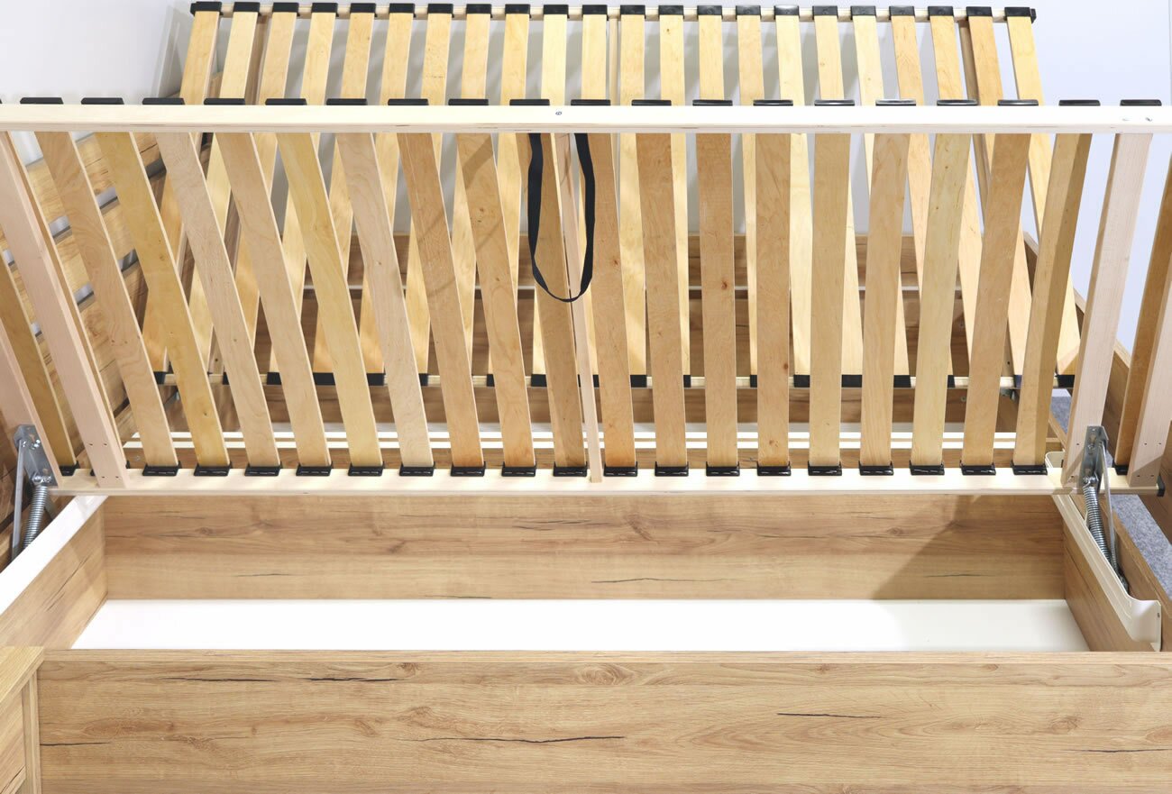 Prístup k úložnému priestoru je zabezpečený pomocou dvoch bočne vyklápacích roštov od nôh, každý s 22 lamelami, čo umožňuje pohodlné každodenné používanie.