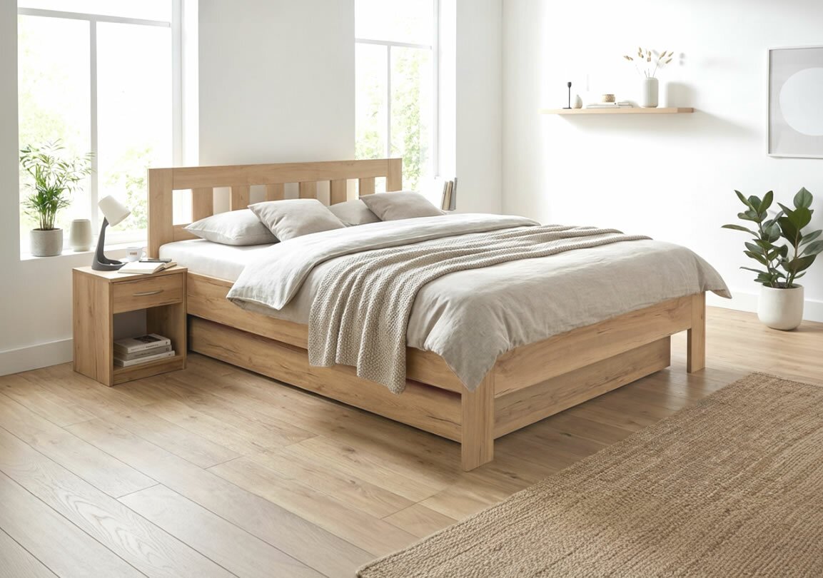 Posteľ MALAGA je vyrobená z laminovanej drevotriesky o hrúbke 25 mm, úložný box má hrúbku 18 mm. Vďaka tomuto prevedeniu ponúka posteľ vysokú pevnosť, stabilitu a dlhú životnosť.