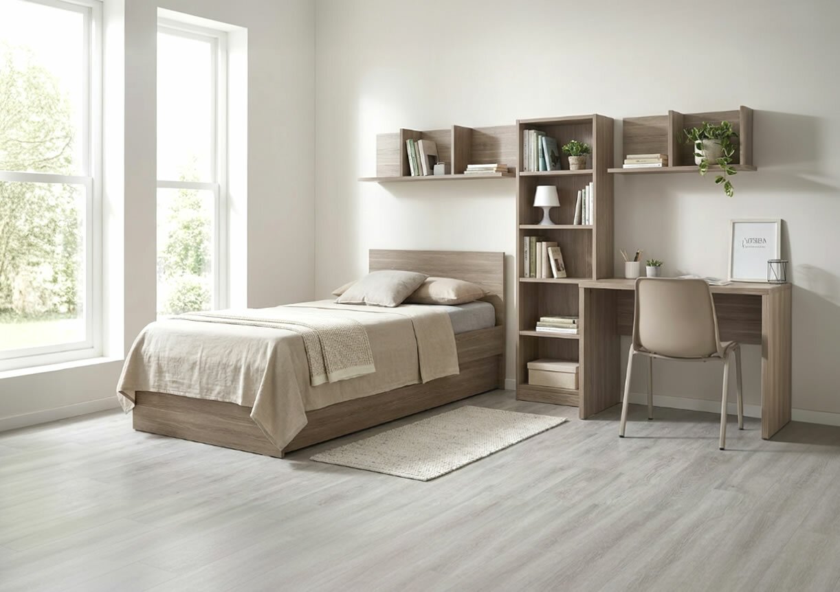 Posteľ HUGO je vyrobená z laminovanej drevotriesky o sile 25 mm, 18 mm (úložný box) a ponúka možnosť výberu z viacerých farebných dezénov. Hrany sú olepené ABS hranou o sile 0,5 a 2 mm.
