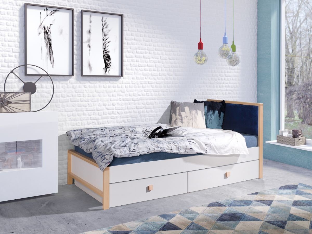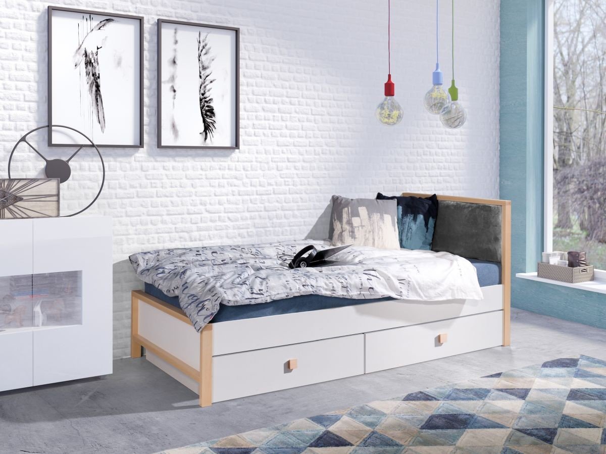 Posteľ s úložným priestorom Zora je vyrobená z kombinácie masívu buku a kvalitného lamina. Súčasťou postele sú dve veľké zásuvky, rošt aj matrac.